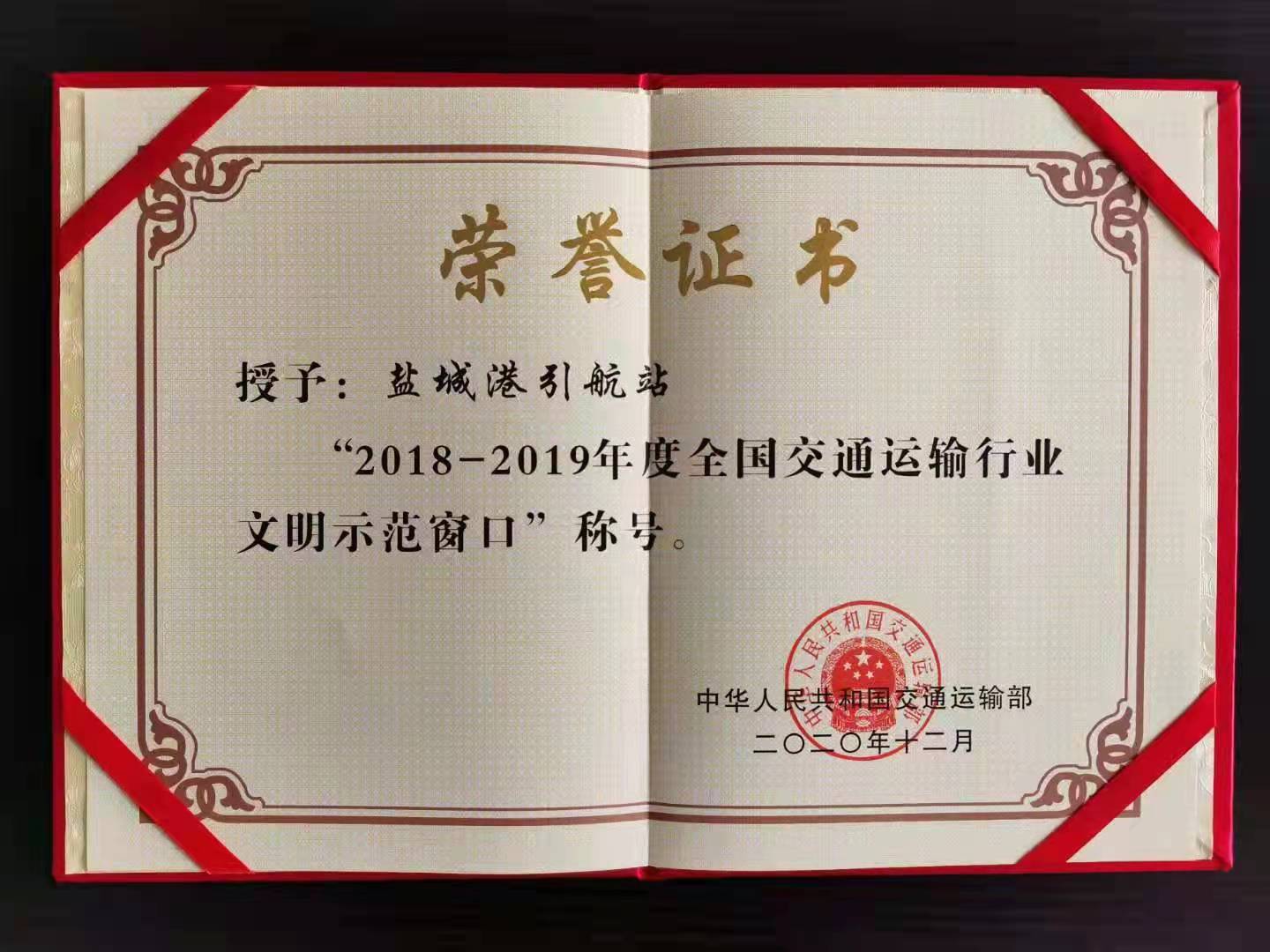 2020年12月,盐城港引航站获得“全国交通运输行业文明示范窗口”荣誉。