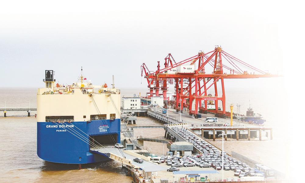 1376辆悦达商品车依次开往盐城港港口公司滚装码头前沿装船。 记者 王焱 摄