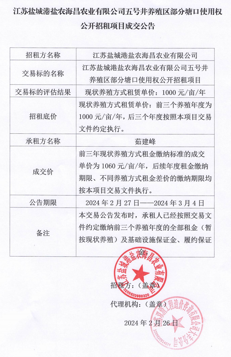 江苏盐城港盐农海昌农业有限公司五号井养殖区部分塘口使用权公开招租项目成交公告