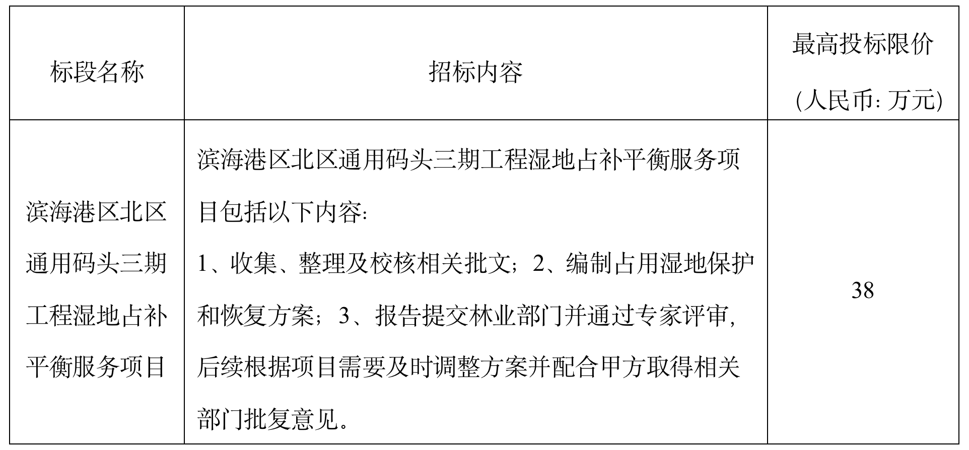 (1)项目名称:滨海港区北区通用码头三期工程湿地占补平衡服务项目。