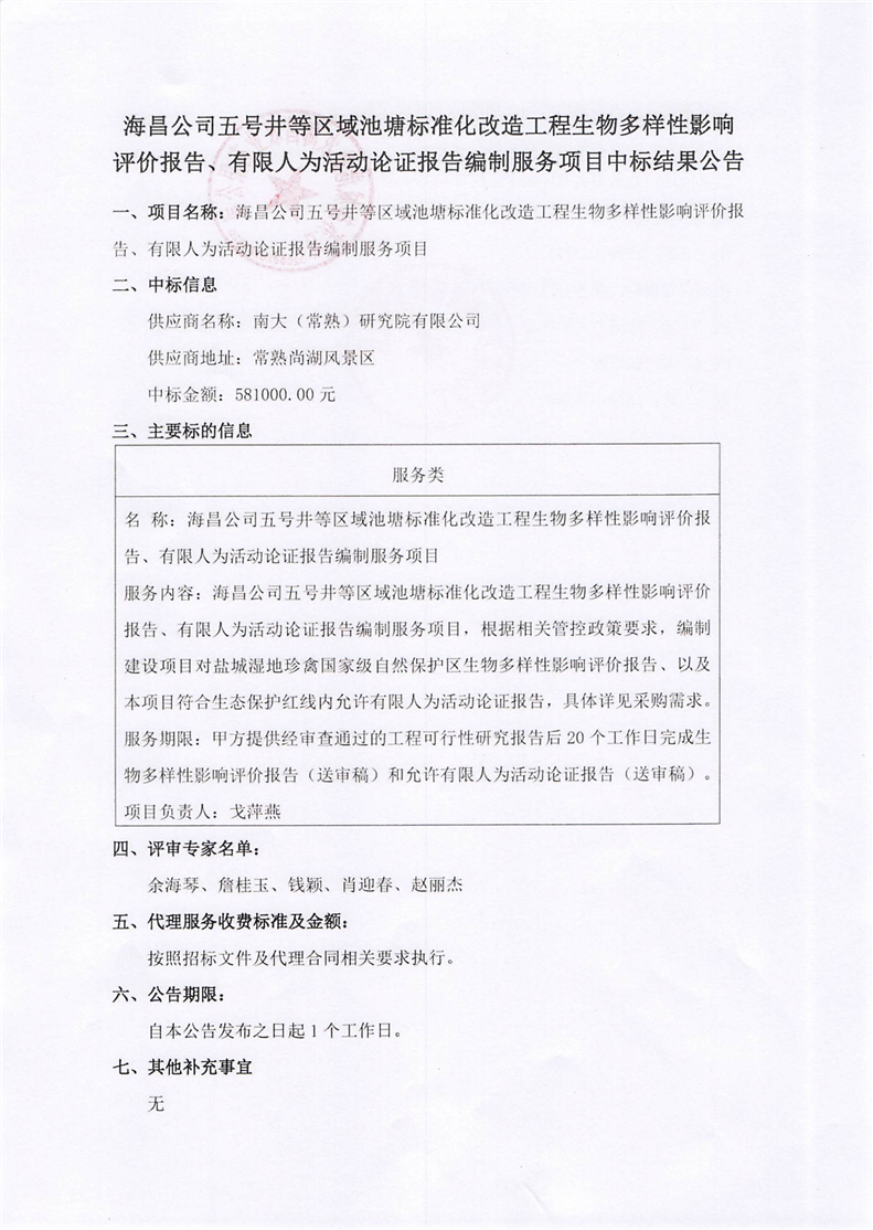 海昌公司五号井等区域池塘标准化改造工程生物多样性影响评价报告、有限人为活动论证报告编制服务项目中标结果公告