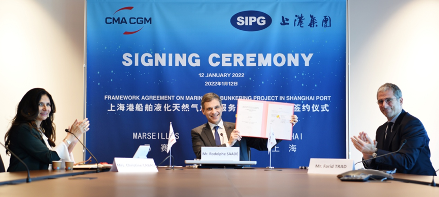 上海国际港务(集团)股份有限公司(“上港集团”)与法国达飞海运集团(“达飞集团”)于2022年1月12日举行了上海港船舶液化天然气(LNG)加注服务项目框架协议签约仪式,上港集团董事长顾金山与达飞集团董事长、首席执行官鲁道夫·萨德出席。