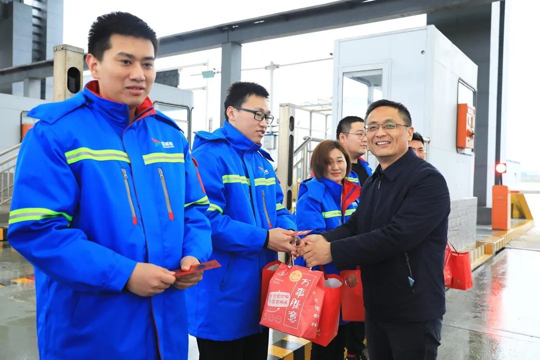 1月22日,大年初一,码头一线到处洋溢着节日喜庆气氛。受集团党委、董事会委托,当天上午,集团党委副书记、董事、总经理陆帅率队前往大丰港区看望慰问坚守在一线工作岗位的工作人员,代表集团党委、董事会向他们致以新春的祝福和节日的问候。盐城海关二级高级主办李健,集团副总经理袁欣等参加。