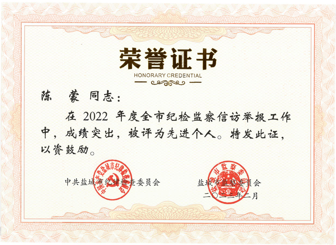 近日,中共盐城市纪委、盐城市监委发布关于表扬2022年度全市纪检监察信访举报工作先进集体和先进个人的决定,集团纪检监察第三派驻组副组长、盐城港引航站党总支书记、盐城港拖轮服务公司支部书记陈蒙同志荣获“2022年度全市纪检监察信访举报工作先进个人”荣誉称号。