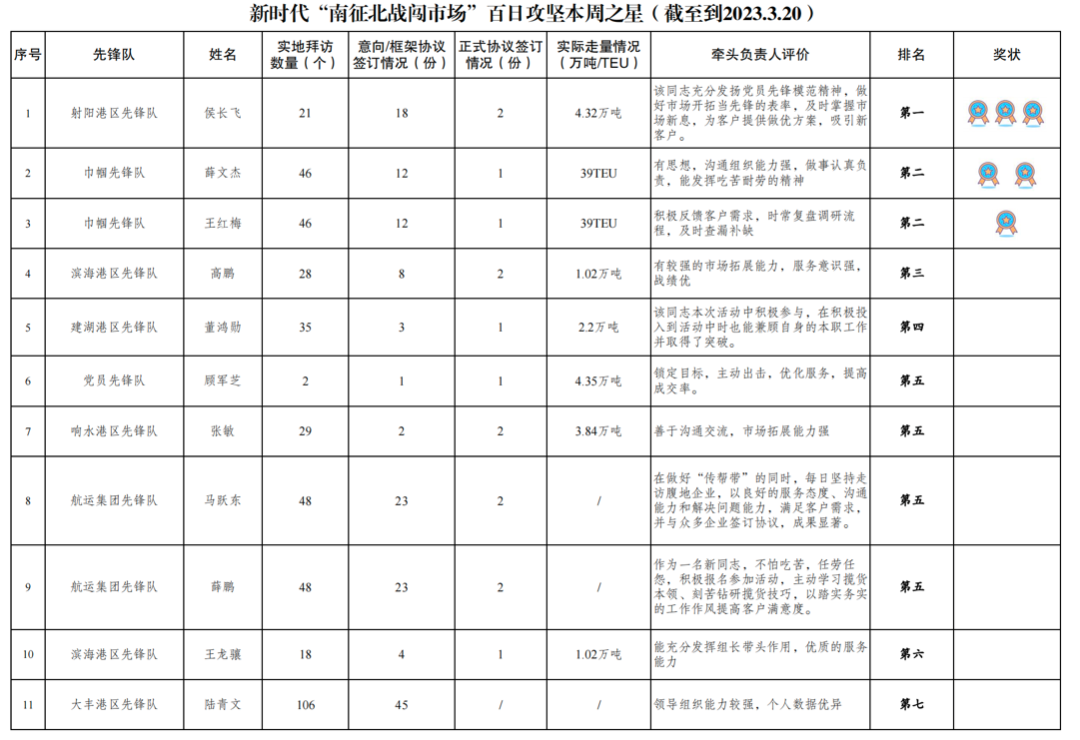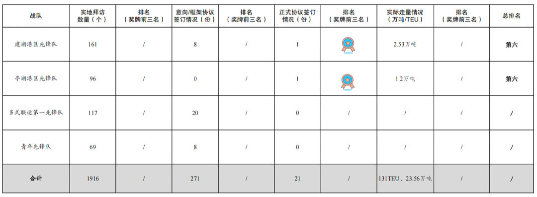 4.实际走量131TEU、23.56万吨:其中党员先锋队4.85万吨,射阳港区先锋队4.32万吨,响水港区先锋队3.84万吨,航运集团先锋队2.79万吨、86TEU,建湖港区先锋队2.53万吨,阜宁港区先锋队1.8万吨,大丰港区先锋队1.21万吨,亭湖港区先锋队1.2万吨,滨海港区先锋队1.02万吨,巾帼先锋队45TEU。