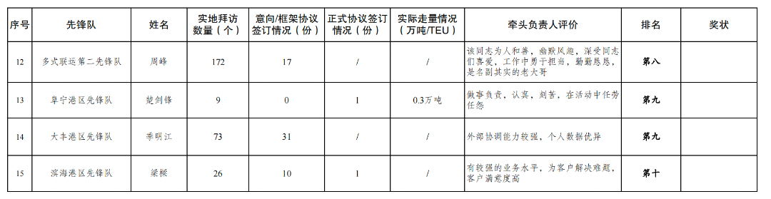 1.累计拜访客户数量1916家:其中多式联运第二先锋队346家,大丰港区先锋队312家,党员先锋队195家,建湖港区先锋队161家,巾帼先锋队158家,射阳港区先锋队125家,多式联运第一先锋队117家,响水港区先锋队110家,滨海港区先锋队102家,亭湖港区先锋队96家,青年先锋队69家,阜宁港区先锋队68家,航运集团先锋队57家。