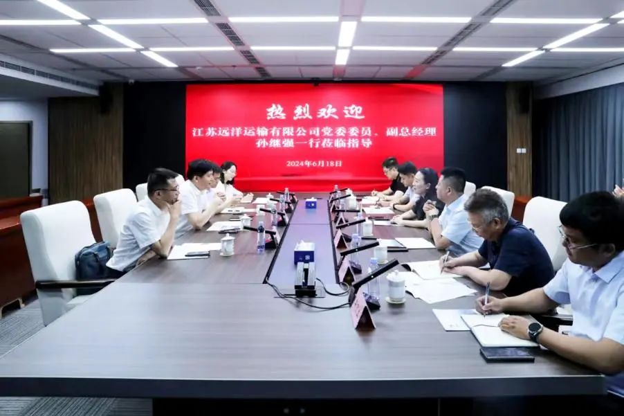 6月18日,江苏远洋运输有限公司党委委员、副总经理孙继强率队拜访我集团,就开展业务合作进行交流。集团副总经理袁欣接待孙继强一行,集团相关负责同志等参加。