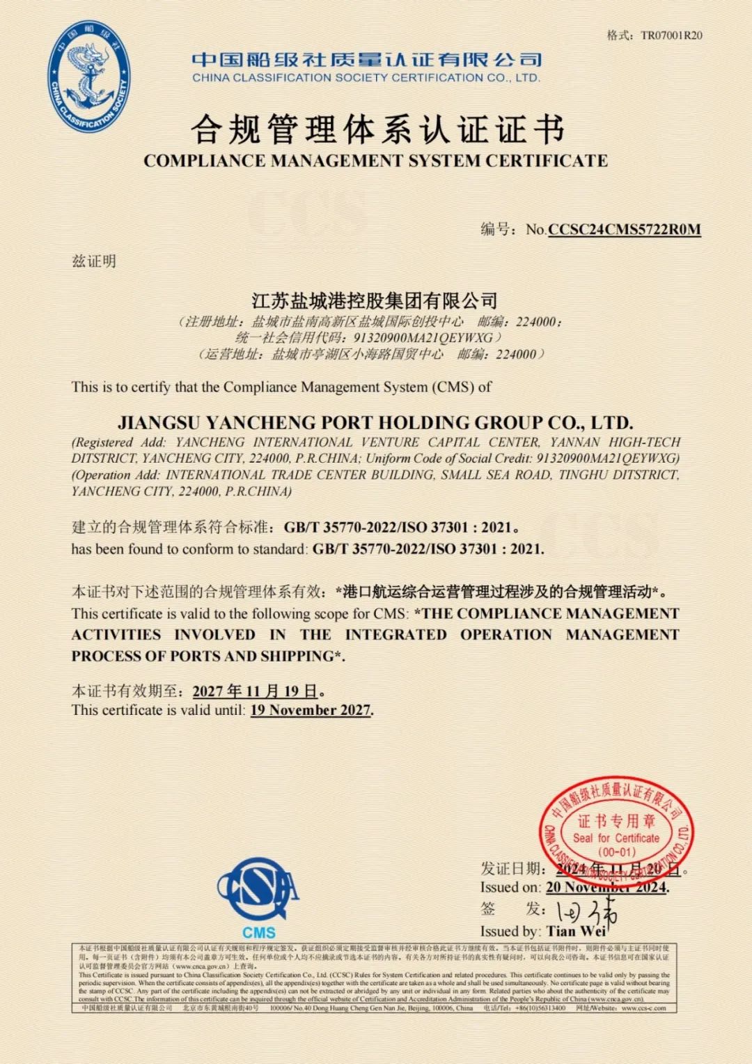 本次合规管理体系认证是由中国船级社质量认证有限公司按照《合规管理体系要求及使用指南》(GB/T35770-2022/ISO 37301:2021)标准,对集团合规管理体系建设情况进行了系统性审查,专家组一致认为盐城港合规管理体系建设满足了标准要求。
