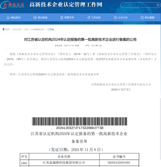 12月3日,盐城港科技集团成功通过“高新技术企业”认定,提前一年完成国家高新技术企业认定的既定目标,标志着德信体育 科技创新工作实现重大突破,迈入转型升级新阶段。