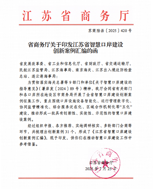 近日,江苏省商务厅印发《江苏省智慧口岸建设创新案例汇编》,德信体育 建设的“一体化海河联运集装箱生产管理系统”成功入选,成为全省31个智慧口岸建设创新案例之一。该系统的运用,实现了港口生产全流程的自动化与协同化,显著提升了作业效率和服务水平,为全省智慧口岸建设提供了可复制、可推广的先进经验。