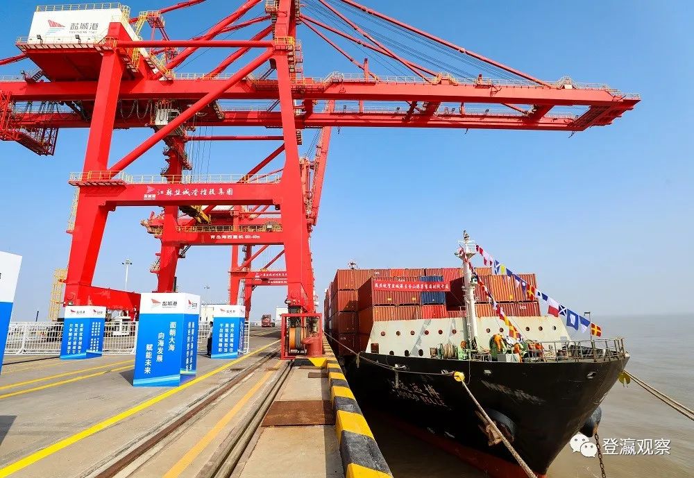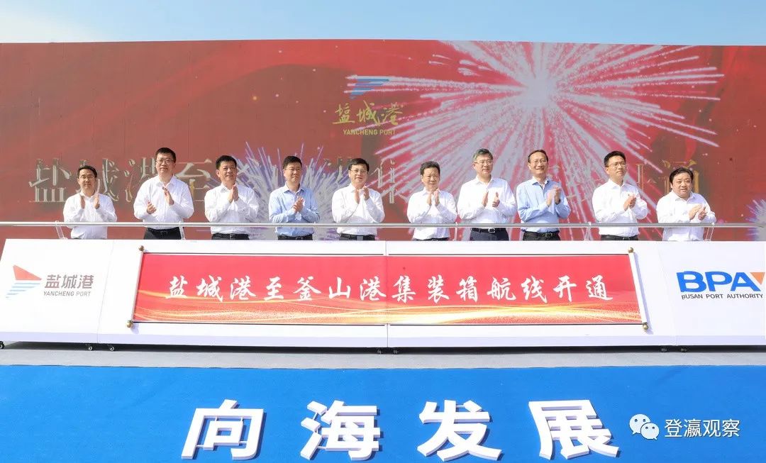 ▲盐城港至韩国釜山港国际直达集装箱班轮航线正式开航