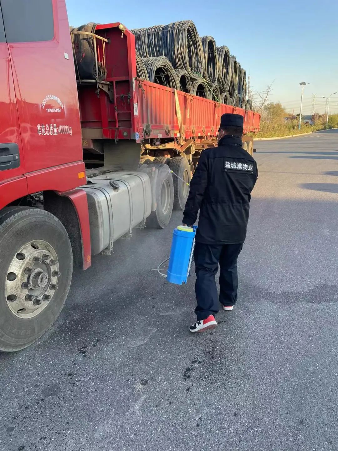 (港区工作人员对进出港区车辆进行消毒)