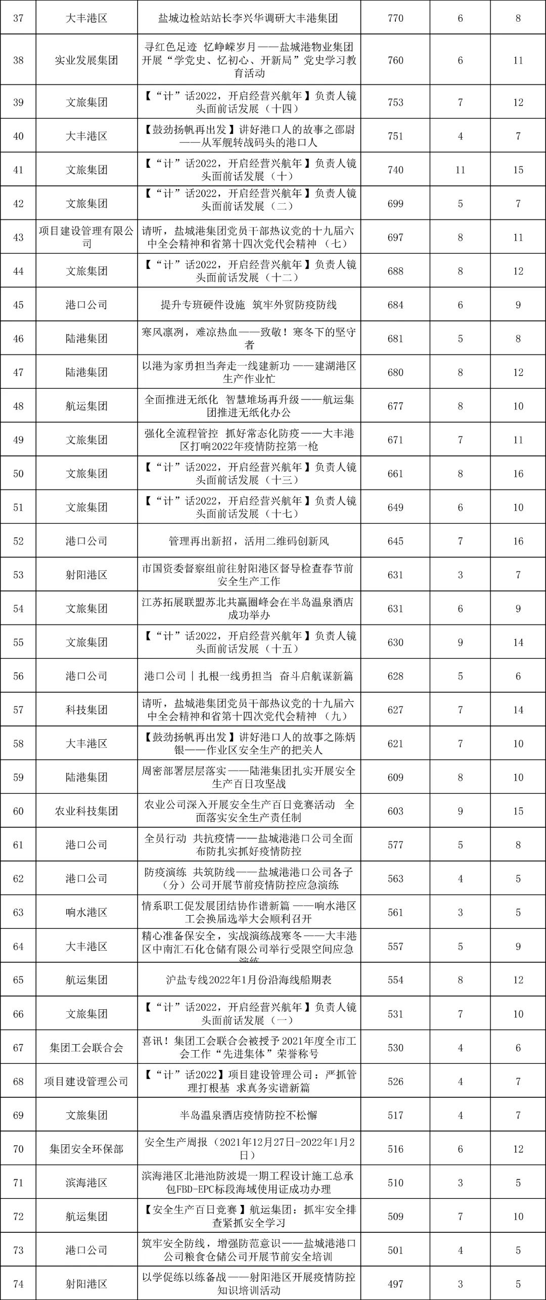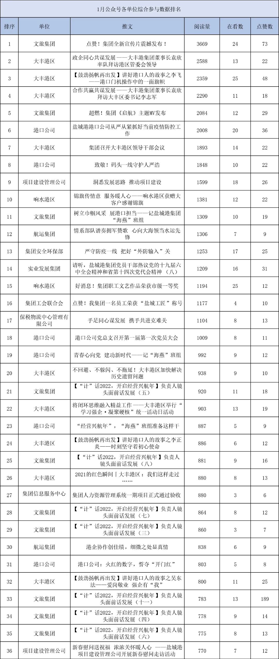 1月,“江苏盐城港控股集团”微信公众号推送文章170篇,截至目前,阅读总量14万+,各单位供稿111篇。其中,文旅集团以2.1万阅读数,24篇稿件量,遥遥领先;大丰港区以1.8万阅读数,16篇稿件量,位列第二;港口公司、响水港区在供稿方面,以同样13篇的数量并列第三,在阅读量方面,港口公司以1.2万的数量,位列单项第三;其他港口及板块集团积极参与,踊跃投稿,情况较好。