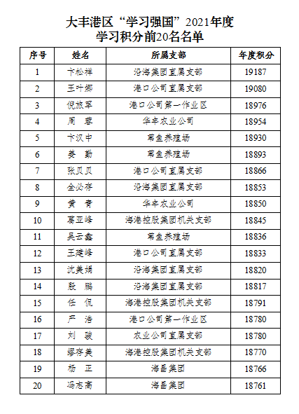 新的一年,为表彰先进、激励后进,持之以恒地提高港区全体干部职工的学习自觉性和主动性,进一步加强学习型党组织建设。近日,大丰港区举行“学习强国”2021年度先进个人颁奖仪式,根据“学习强国”APP大丰港区年度学习积分排名,对成绩突出的前20名“学习达人”代表进行了表彰,并颁发荣誉证书。