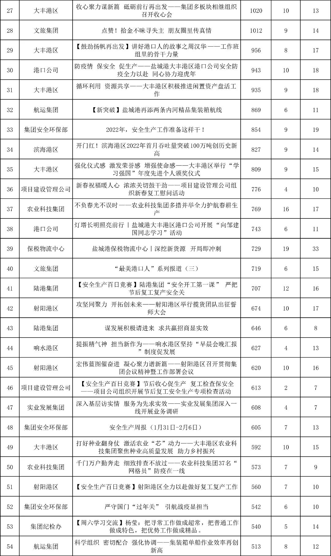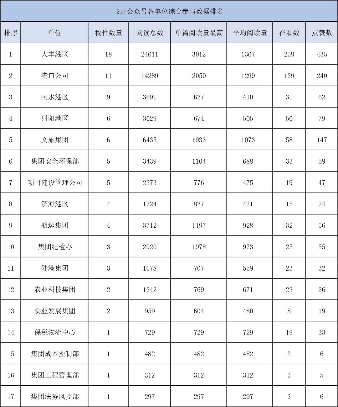 “首季开门红”向来是新闻报道的高产期,特别是一线生产单位亮点频出。从二月份稿件数据统计来看,大丰港区依然蝉联第一“宝座”,发稿18篇;港口公司继续发力,成稿11篇,位列第二;响水港区紧随其后,发稿9篇。其他单位齐齐发力,纷纷积极供稿!