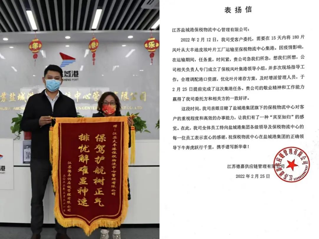 盐城港保税物流中心围绕集团党委“经营兴航年”“改革攻坚年”部署要求,秉承“客户至上,服务为本”的经营理念,不断提升服务水平,提高专业素养。同时,保税物流中心为切实做好疫情防控工作,针对进出货物采取划界作业,装卸专班人员区域内作业等要求,真正做到了生产经营、疫情防控两手抓、两手硬、两不误。细致周到、高效便捷的服务也赢得了社会各界的广泛赞誉,部分客户还特意送来了锦旗和感谢信以表达他们的感激之情。