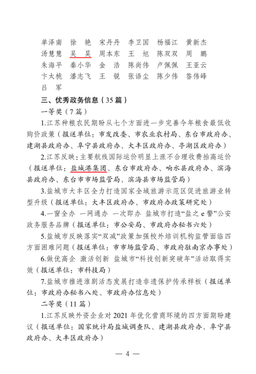 3月8日,市政府办公室公布2021年度全市政务信息工作考核结果,集团获评“2021年全市政务信息工作先进单位”,位列市直报点单位前列。同时,我集团参与报送的《江苏反映:主要航线国际运价明显上涨不合理收费抬高运价》荣获优秀政务信息一等奖。集团新闻条线一名同志获“2021年全市政务信息工作先进个人”称号。
