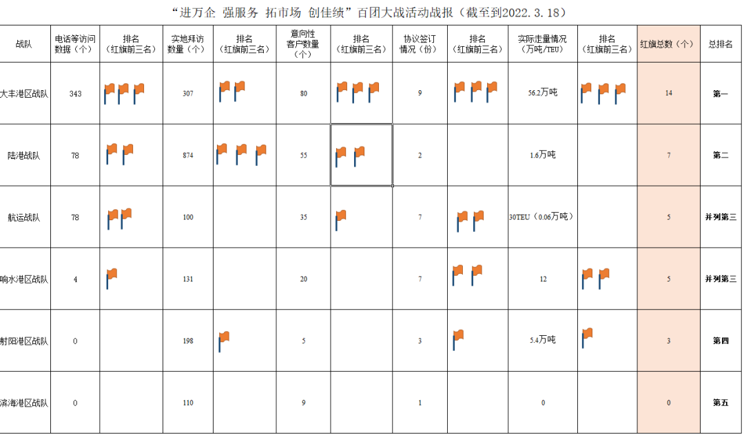 2.滨海港区战队:在拜访活动中,滨海港区战队不仅仅局限于规上企业名单,拜访的同时也不忘挖掘周边有可能的企业。通过这种做法也是成功发掘一家化肥贸易企业,吞吐量50万吨,正在商讨合同条款,预计下周签订合同并开始走量。
