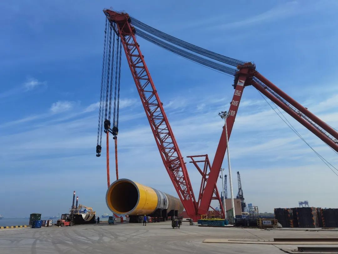 5月28日,盐城港响水港区小蟒牛作业区公用重件码头现场一派繁忙景象,由公用重件码头后方陆域打砂除锈喷涂并进行拼接组装的首件风电桩基,通过自行模块车运输至码头前沿。该件总长75米、直径8米、总重达1055.1吨,由1100t-51m巨无霸固定桅杆吊稳稳吊起,缓缓地放置在驳船搁置梁上,出海驶向渤海风电建设现场。