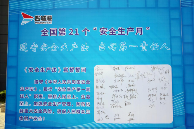 今年6月是全国第21个、全省第29个“安全生产月”,主题是“遵守安全生产法、当好第一责任人”。为促进安全生产形势持续稳定向好,保障德信体育 “经营兴航年”各项目标指标顺利完成,按照德信体育 统一部署,6月2日,大丰港区举行2022年安全生产月宣誓承诺活动。大丰港区各二级公司班子成员及安全条线人员参加。