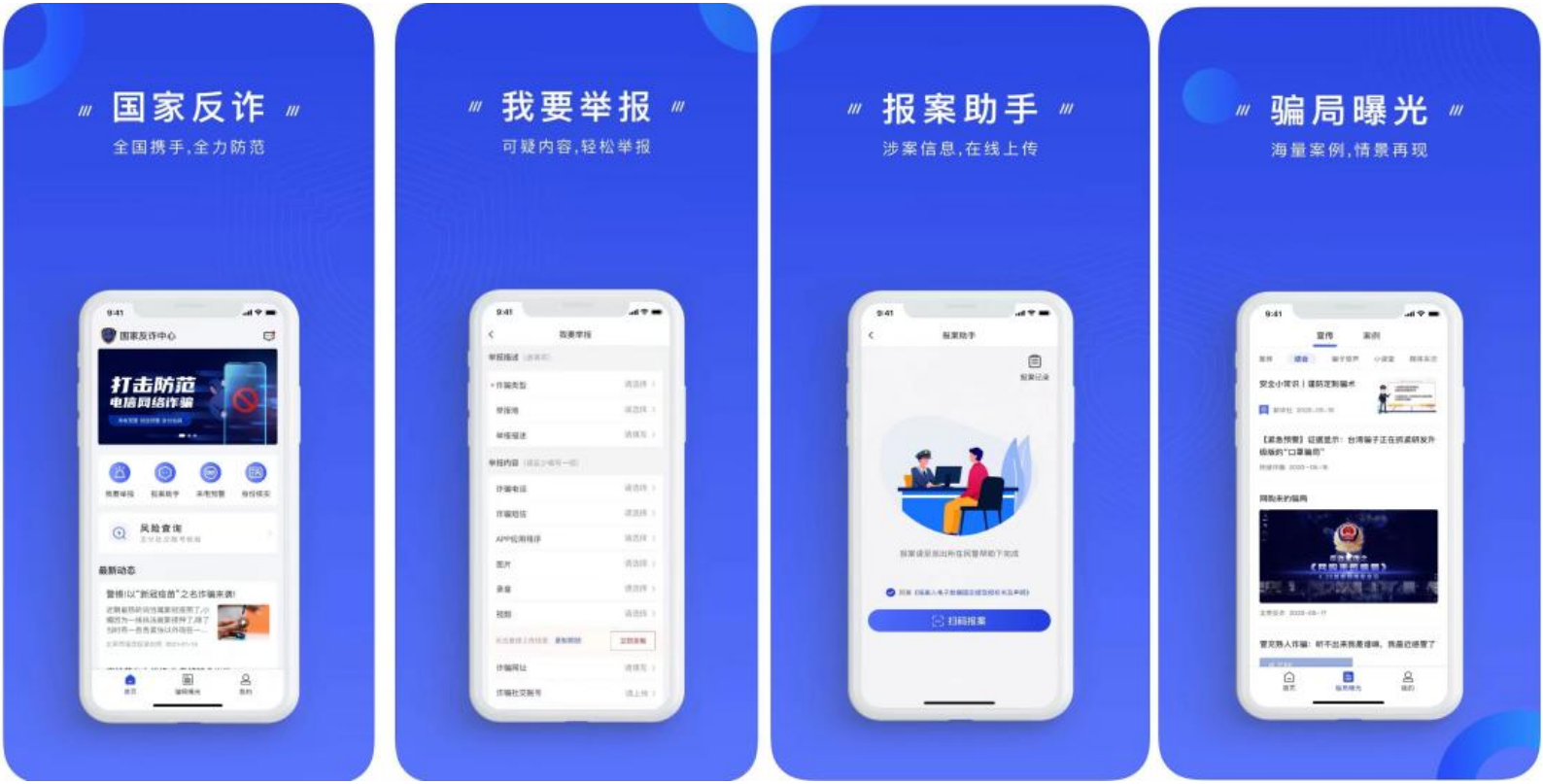 “国家反诈中心APP”是由公安部刑事侦查局提供的用于接受诈骗举报的APP。它可以免费提供防骗保护,当收到涉嫌诈骗的电话、短信、网址或安装涉嫌诈骗的APP时,可以智能识别预警;并可以对非法可疑的电信网络诈骗行为进行在线举报,为公安机关提供更多的反诈线索,在后台及时封杀;当涉及陌生账号转账时,可以验证对方的账号是否涉嫌诈骗,及时规避被骗风险;平台还会定期推送防诈骗文章、曝光最新诈骗案例,提高防骗意识。