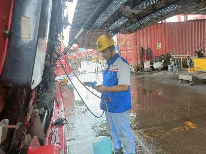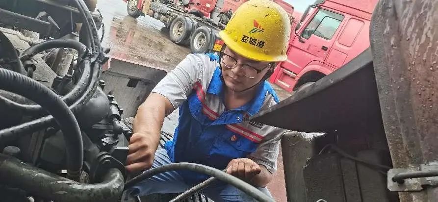 连续的高温,让穿梭于码头与堆场的车辆,也会受不住“中暑生病”,出现散热不畅、空调不制冷、控制器高温等故障。为保证码头的正常运营,陆晨不顾已超40℃的体感温度,戴上工作手套,拿着他的工具箱,打开已达60℃的发动机,用手触摸每一个部件来寻找“症结”。汗水不断滑下,工作服也因汗水而浸湿,紧紧贴在身上,但陆晨全然不顾,只一心一意、专心致志为集卡车“把脉问诊”。高温下的时间总是显得很缓慢,陆晨擦了檫脸上的汗笑着说:“我工作10年了,刚开始也不适应,但因为喜欢车,慢慢也就习惯了。”陆晨介绍,除发动机外,在密闭驾驶室内检修,也是一大考验。车厢外40℃左右的高温,驾驶室内则完全密闭,很多人是受不了的。“任何一台集卡车都离不开我们修理工。”陆晨说,“我的任务就是尽自己最大努力修理车辆,保证码头的正常运转”。