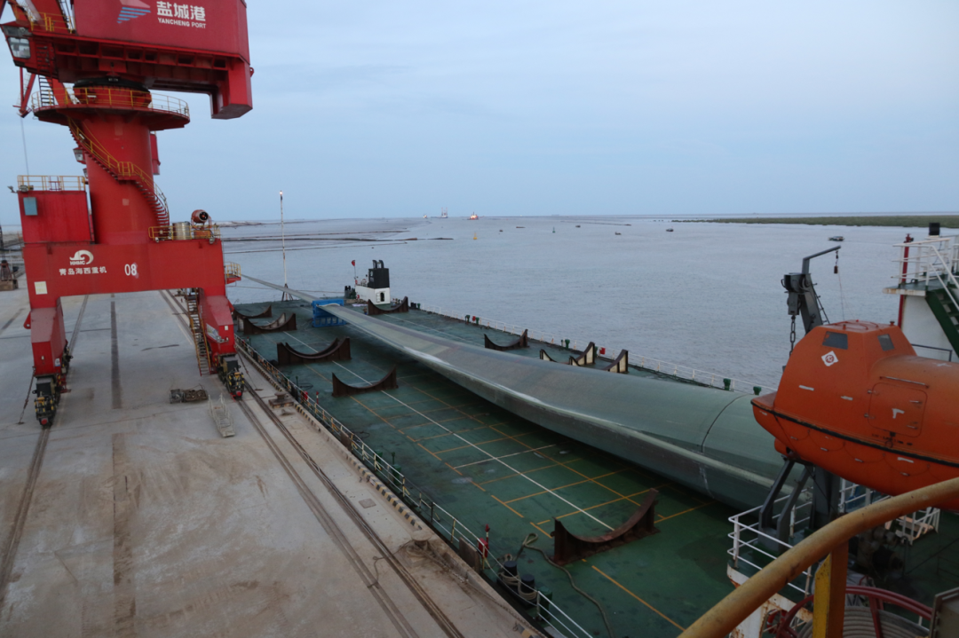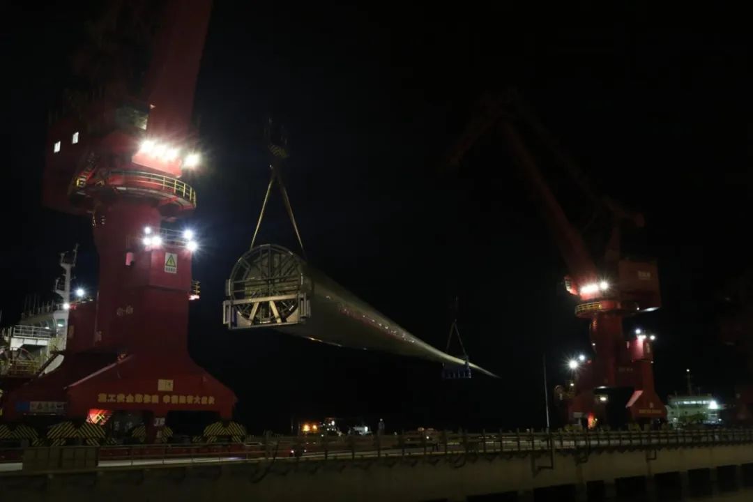 “指挥就位”“车辆就位”“装卸就位”“安全员就位”......9月30日晚,在一系列作业准备就绪后,全球最长风电叶片在盐城港射阳港区风电码头成功完成装卸,再度刷新盐城港装卸风电叶片长度新纪录,向党的二十大献上了一份厚礼。