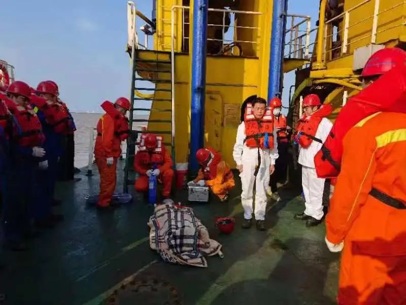随后进行的是人员落水演习。“报告,皮龙队一人整理皮龙带时不慎落水。”“天虎号”船长接报后立刻指令驾驶员发出有人落水警报,并通知交通船协助救援,同时向项目部、公司调度室报告人员落水情况;打捞队将落水人员救捞上来后,救护队采用控水、心肺复苏等急救措施对落水人员进行模拟救助,经抢救后落水者苏醒,船长安排相关人员将落水者送往医院接受进一步检查。
