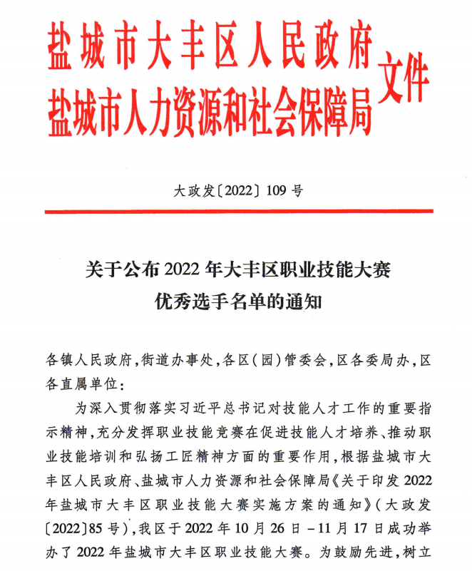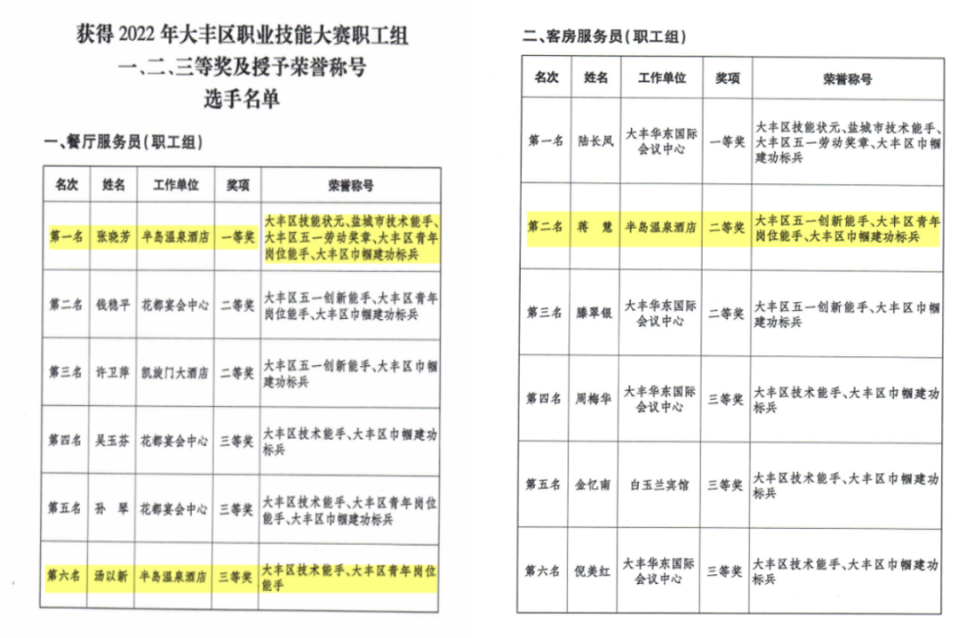 本次技能大赛结果由盐城市大丰区人民政府、盐城市人力资源和社会保障局联合发布—《关于公布2022年大丰区职业技能大赛优秀选手名单的通知》。港泊半岛酒店参赛选手们取得可喜成绩,其中餐饮部张晓芳同志以优异的成绩脱颖而出,勇夺餐饮服务竞赛项目一等奖,并由盐城市大丰区人民政府等5个部门分别授予“大丰区技能状元”“盐城市技术能手”“大丰区五一劳动奖章”等荣誉称号;餐饮部汤以新同志荣获“大丰区技术能手”“大丰区青年岗位能手”称号;客房部蒋慧同志荣获客房竞赛项目组二等奖,并获“大丰区五一创新能手”“大丰区青年岗位能手”“大丰区巾帼建功标兵”荣誉称号。