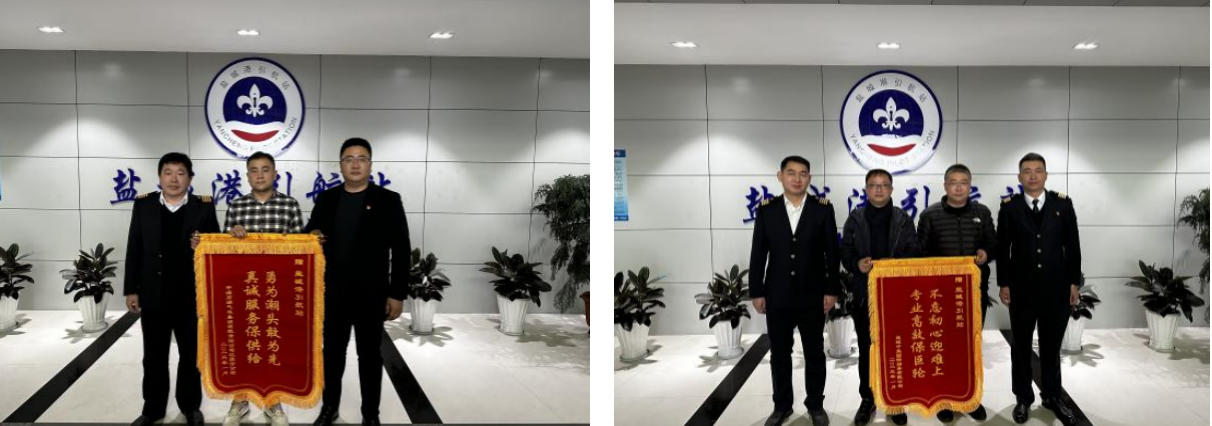 1月12日,中海油江苏天然气公司、中海石油气电集团、盐城中能国际船务公司一行向盐城港引航站赠送了题为“真诚服务保供给,勇为潮头敢为先”“专业高效保巨轮,不忘初心迎难上”的锦旗,对盐城港引航站在为中国海油盐城“绿能港”冬季能源保供保畅过程中提供的热情帮助和优质服务,以及引航员们在保障LNG船舶安全靠泊所作出的努力奉献表示感谢。
