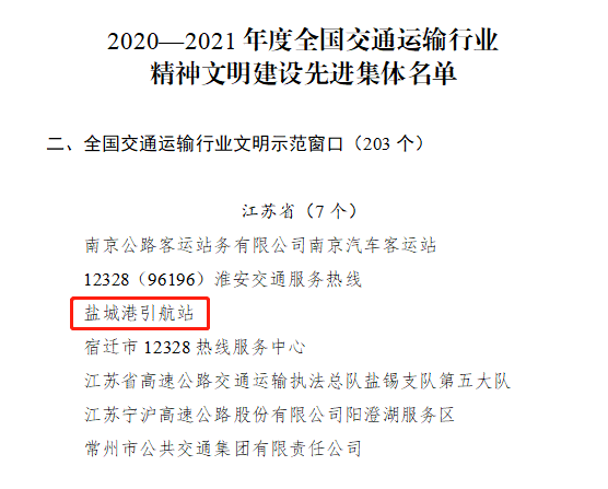 近日,交通运输部印发《关于命名2020—2021年度全国交通运输行业精神文明建设先进集体的决定》,盐城港引航站作为2018—2019年度“全国交通运输行业文明示范窗口”经过复核确认,继续保留称号,且是我市唯一获得该项荣誉的单位。