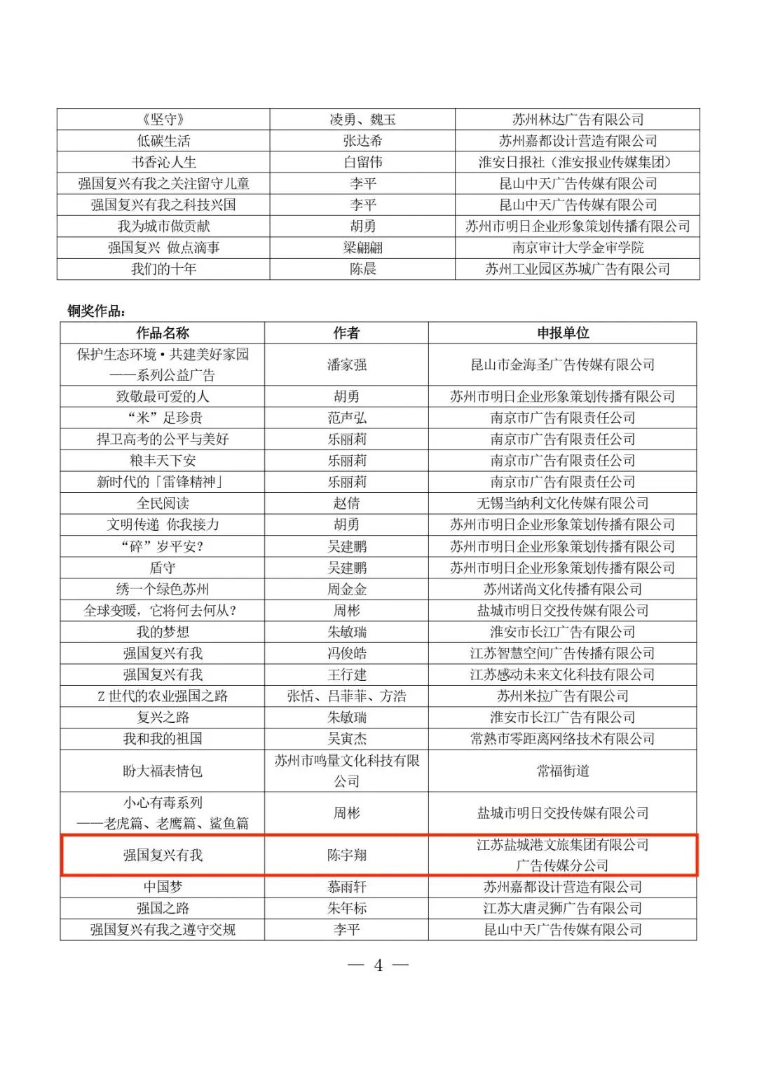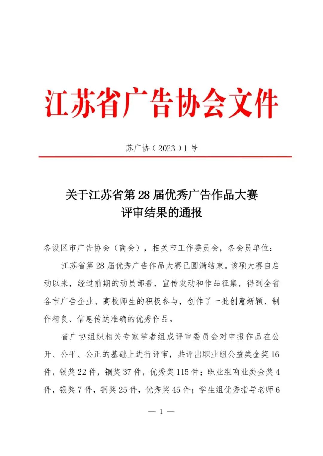 据悉,“江苏省优秀广告作品大赛”由江苏省广告协会主办,迄今为止已举办28届,吸引了省内数百家公司参与,每届赛事均有数千个作品参加比赛。本届大赛,文旅集团广告传媒分公司凭借过硬的专业实力荣获职业组公益类作品铜奖和职业组公益类作品优秀奖。