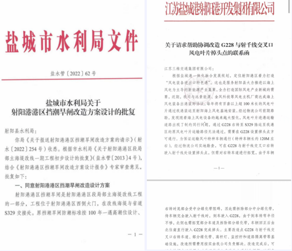射阳港区在风电业务市场调研拜访客户时发现,随着海上风电设备大型化发展趋势,120米以上风电叶片运输在S329和G228的进射阳港交汇处,受道路限高、转弯半径小等影响,叶片运输不能安全通过,存在运输堵点;同时还发现,射阳龙源海上风电场项目采用的远景能源8.5MW主机宽度在8米以上,而射阳港区S329进港道路上的挡潮旱闸,位于道路中间位置且建有混凝土中墩,导致通行宽度不足8米,成为又一运输堵点。