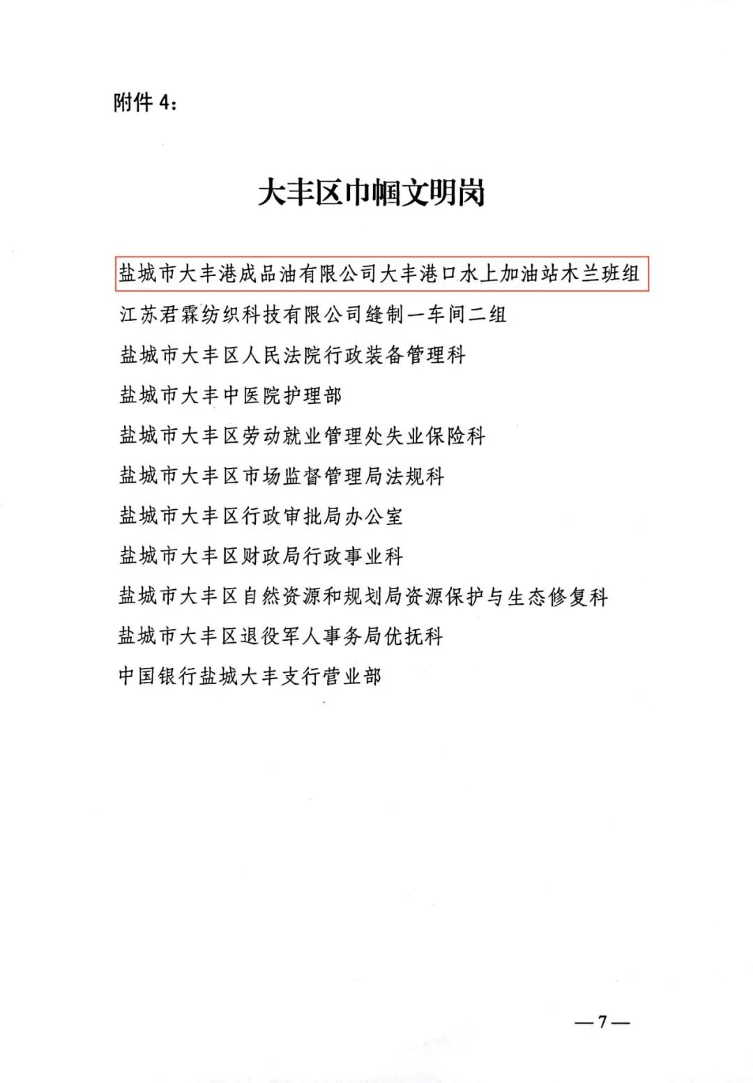 近日,大丰区妇女联合会发表《关于表扬2022年度大丰区三八红旗手(集体)和大丰区巾帼建功标兵、巾帼文明岗的通报》,盐城港大丰港区成品油公司水上加油站“木兰”班组荣获“巾帼文明岗”荣誉称号,班组成员王亚敏荣获“三八红旗手”荣誉称号。