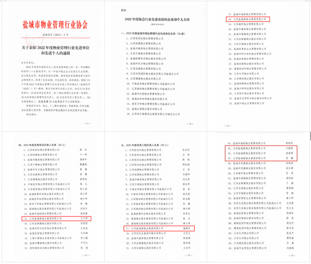 近日,盐城市物业管理行业协会召开第三届第四次全体会员会议,对2022年度盐城市优秀物业企业和优秀个人进行表彰颁奖。盐城港物业公司再度获评“市物业管理行业先进单位”,王月琴、施建友、王晓莉、房俤君、吴静等同志分获“2022年度优秀项目负责人”“2022年度优秀工程负责人”“2022年度盐城市物业管理行业美丽物业人”荣誉称号。