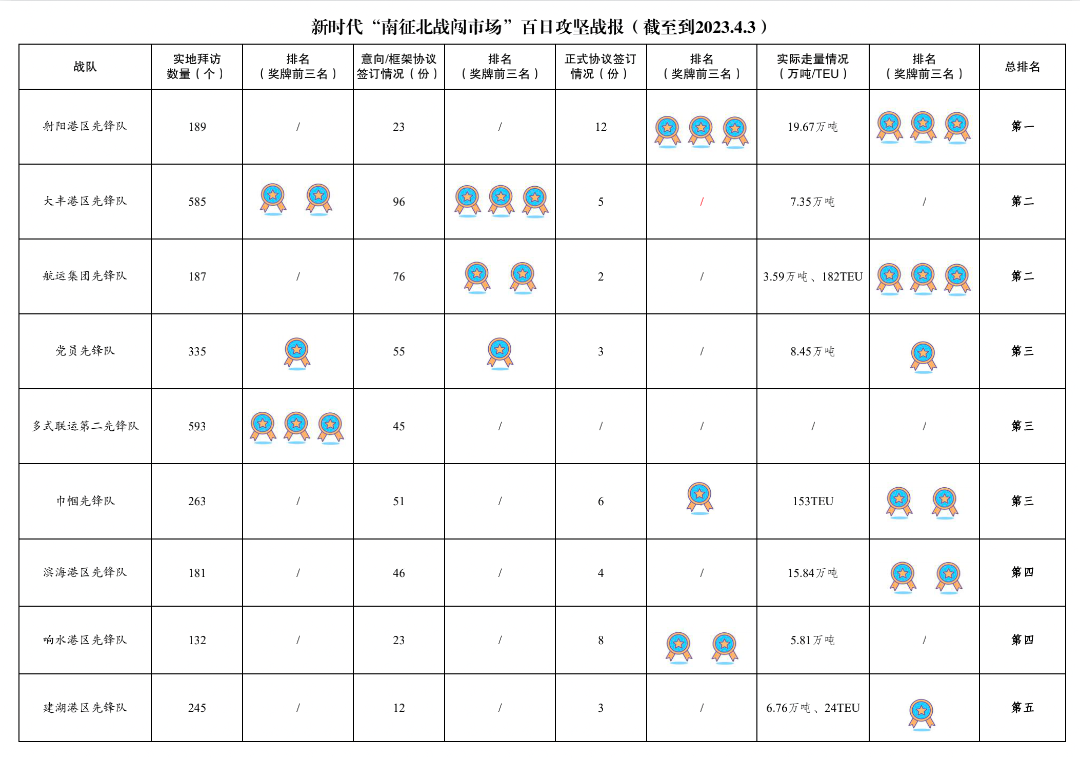 第一名:航运集团先锋队3.59万吨、182TEU,射阳港区先锋队19.67万吨