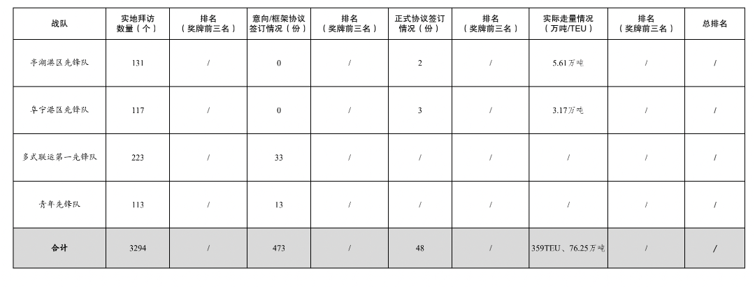 活动开展以来,累计拜访客户数量3294家,签订意向/框架协议数量473份,签订正式协议48份,实际走量359TEU、76.25万吨。