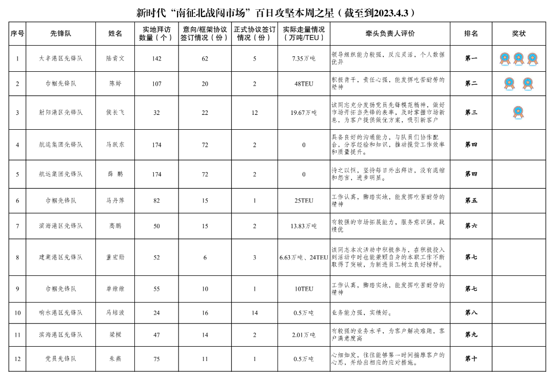 第一名:大丰港区先锋队 陆青文(拜访客户142家,签订意向协议62份,签订正式协议5份,实际走量7.35万吨)