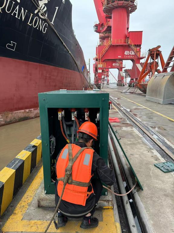6月1日,随着最后一座智慧岸电完成调试并投入使用,“中铁桩号”打桩船成功接入岸电,这标志着盐城港智慧岸电升级改造工作圆满完成。此前连续运转的“中铁桩号”终于得以“休息片刻”,轰鸣声消失让作业人员收获了难得的安静,码头废气零排放让空气也清新了几分在为码头带来更加舒适的作业环境的同时,有效减少了船舶燃油消耗。