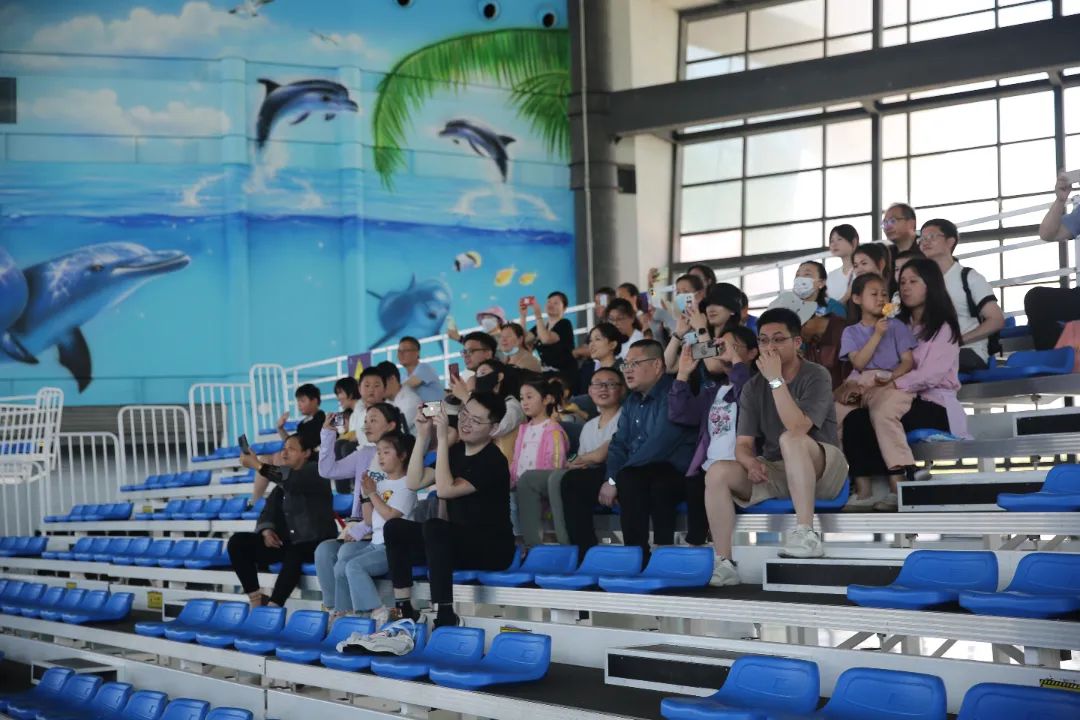 盐城港大丰港区海洋世界是以海洋为主题的情景剧式互动体验馆,在这里,小朋友们观看了海豚表演、了解了海洋知识。在柔和的音乐声中,海豚开始表演节目,从水中一跃而上,溅起晶莹的水花,而后如同身姿矫健的跳水运动员轻轻落入水中;它们在训导员的指挥下,尽情地舞动着,展现着优美的舞姿。现场响起了一阵阵喝彩和掌声,整个表演都充满了灵性,观众们深深地被海豚的英姿所震撼。表演结束后,现场还有和海豚合影的机会,小朋友们大胆伸出双手去抚摸它们,现场气氛热烈,小朋友们流连忘返。