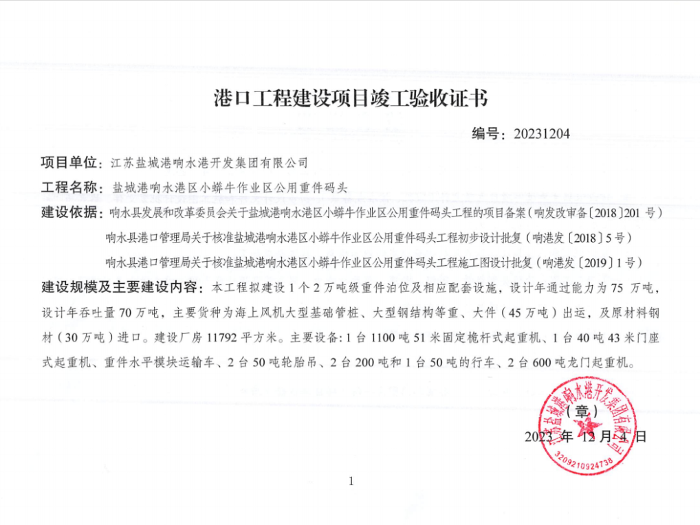 本工程位建设1个2万吨级重件泊位(水工结构兼顾5万吨级船舶)及相应配套设施,码头前沿设置一台最大起吊能力达1200吨的固定桅杆式起重机,是目前江苏沿海港口起吊能力最大的专用重件码头。码头功能定位为以风电重、大件货物为主,兼顾钢材等件杂货,设计年通过能力75万吨。此次竣工验收现场核查组由连云港海事局灌河海事处、连云港海事局响水海事大队、盐城市交通运输局、盐城市交通运输综合行政执法支队、响水县交通运输局、盐城市响水工业经济区管委会等相关部门代表及5名特邀专家组成。在验收会上,核查组认真听取了项目参建单位的汇报,对工程实体建设情况做出了综合评价,经会议讨论,一致同意该工程通过竣工验收。