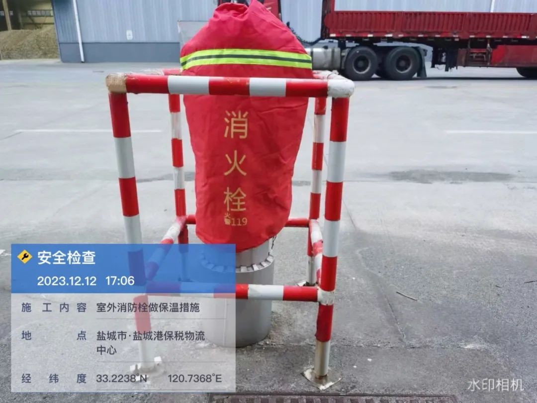 保税物流中心坚持“抓早、抓紧、抓实、抓细”的原则对公司区域内消防管网开展冬季防冻维保工作。主要是对库区室外消火栓、消防管网加装防冻保温措施,防止消防管道因极寒天气发生冰冻、破裂,并进一步强化消防系统巡查,切实做到每台设备有人管,每条管线有人查,确保各消防设备安全平稳过冬。