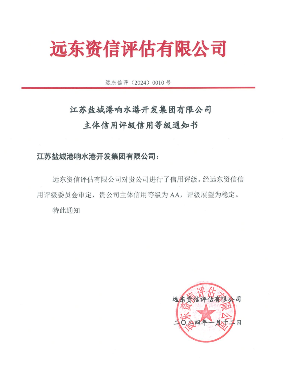 近日,远东资信信用评级委员会审定,江苏盐城港响水港开发集团有限公司成功取得AA主体信用评级,评级展望为稳定。