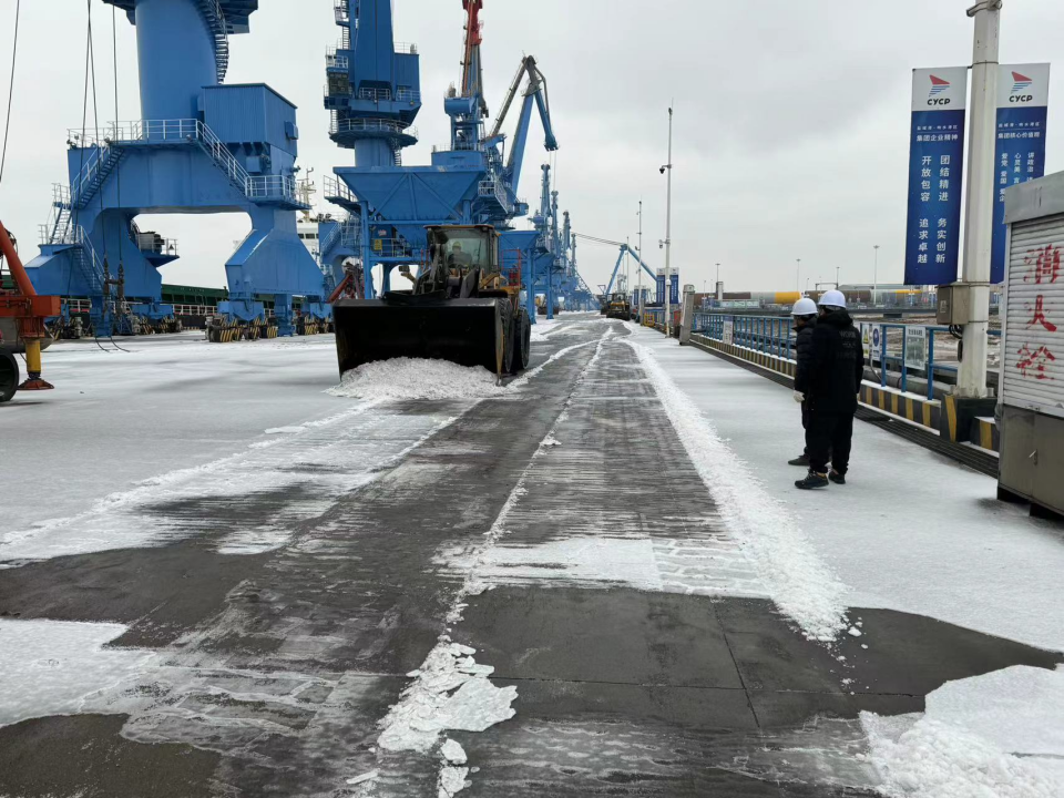 为排除现场积雪,防止道路结冰带来的安全隐患,响水港区采取“机械+人工”协同作业模式,对港区重点区域、主要道路和交通要道等进行清扫,同时根据道路积雪情况,适时组织抛撒融雪剂,全力以赴保障港区道路畅通及职工出行安全。