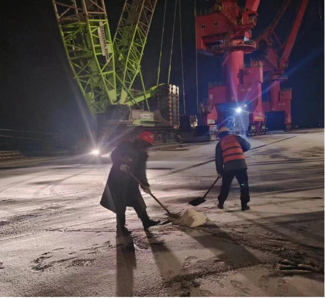 为保证车辆的装卸和安全行驶,22日夜间,射阳港区风电公司第一时间对积雪进行了撒盐融化处理,并用铁锹和扫帚将积雪清理到道路两旁,以防止夜间结冰。