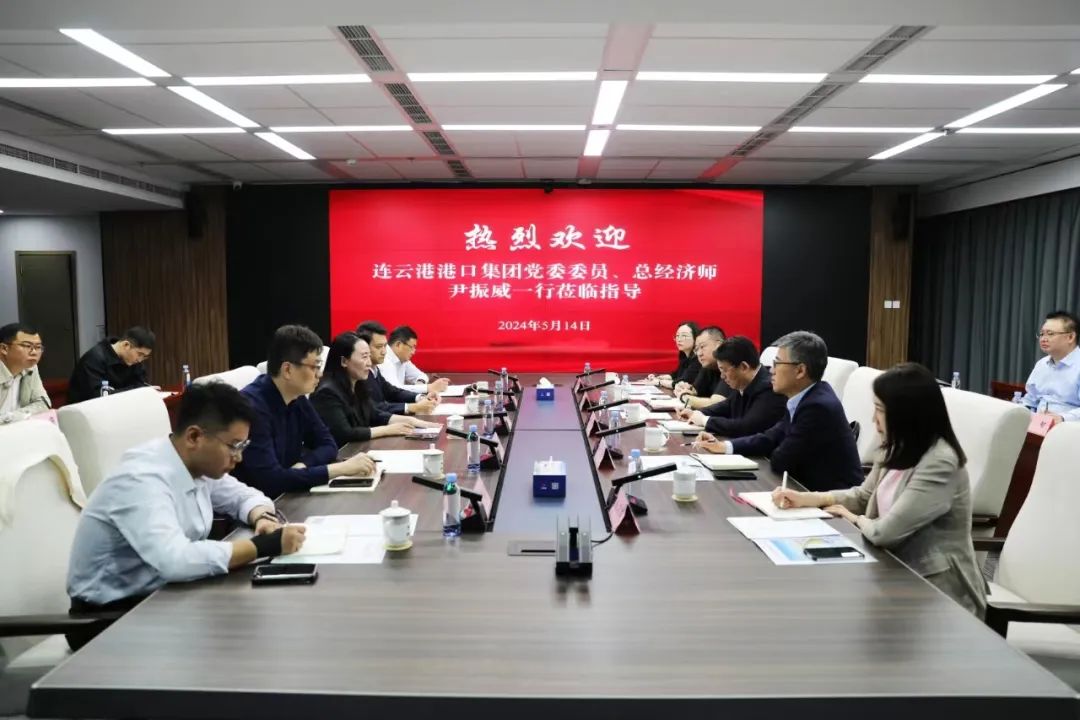 5月14日,连云港港口集团党委委员、总经济师尹振威率队拜访我集团,就沿海支线、海河联运等业务合作事项进行交流。集团副总经理袁欣接待尹振威一行。