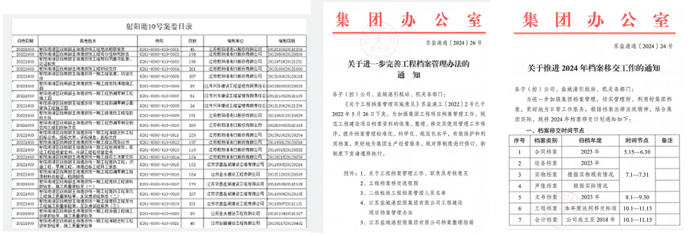 为切实做好工程项目档案的精细化管理,射阳港区认真学习、贯彻执行德信体育 关于档案精细化管理要求,在全体系、各层面、多角度上下功夫,坚持“标准化”整档、“集约化”存档、“数字化”建档,不断推动档案管理数据化体系建立健全,为工程项目提供更加精准有效的数据支撑,保障项目进度畅通推进。