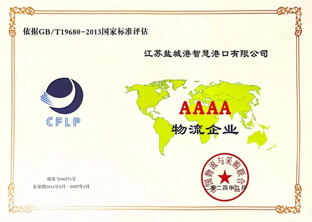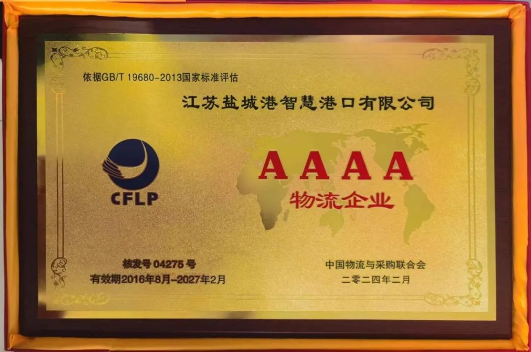近日,由中国物流与采购联合会主办的“第七届中国(合肥)物流与供应链金融创新发展大会暨37届物流企业授牌大会”在安徽合肥盛大召开,盐城港智慧港口公司凭借出色的物流服务质量和规范化的运营水平,被评为“AAAA级物流企业”,不仅标志着智慧港口公司在规范化、标准化运营方面已达到国家标准,物流服务模式得到了行业的高度认可,也为公司进一步发展和提升品牌影响力奠定了坚实的基础。