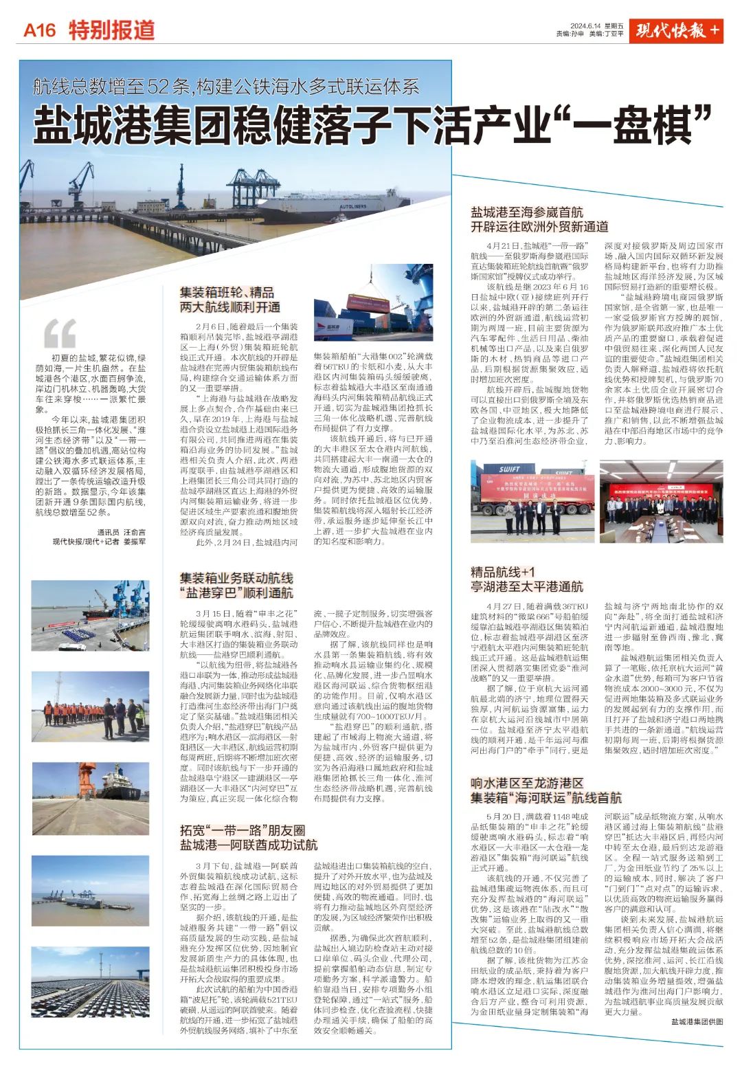 此外,2月24日,盐城港内河集装箱船舶“大港集002”轮满载着56TEU的卡纸和小麦,从大丰港区内河集装箱码头缓缓驶离,标志着盐城港大丰港区至南通通海码头内河集装箱精品航线正式开通,切实为德信体育 抢抓长三角一体化战略机遇、完善航线布局提供了有力支撑。
