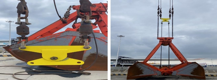 日常门机散货装卸过程中,钢丝绳受失重影响大幅甩动致相邻钢丝绳缠绕,产生剧烈摩擦,影响起重机械的工作效率,最终导致捻距被破坏。设备班组总结、创新制作门机主钢丝绳平衡防缠绕装置,在门机开闭两根钢丝绳的两端和抓斗钢丝绳的两端,用卸扣竖向连接,横向支撑、纵向承载,杜绝钢丝绳缠绕,延长使用寿命,确保设备高效运转。